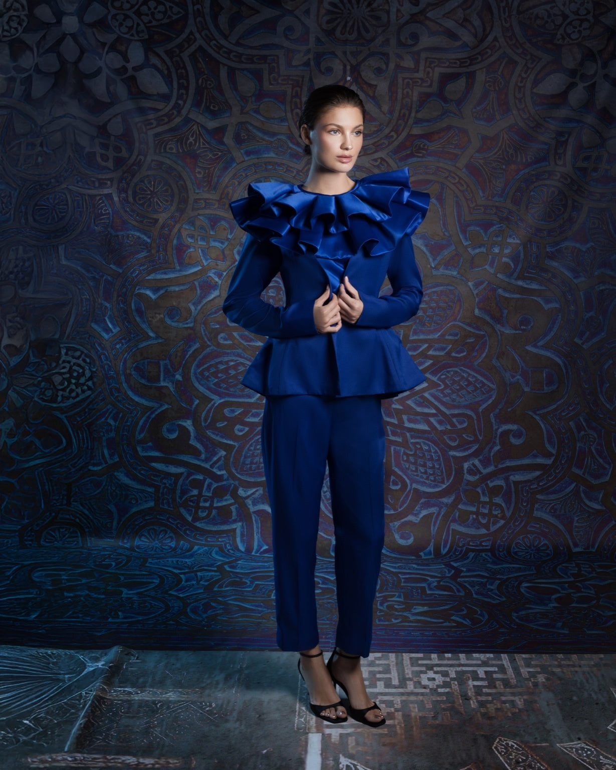 A statement three-piece suit crafted from luxurious crepe fabric, paired with a soft taffeta inner blouse. The sculpted ruffle detailing adds depth and dimension, highlighting the architectural inspiration behind the design.