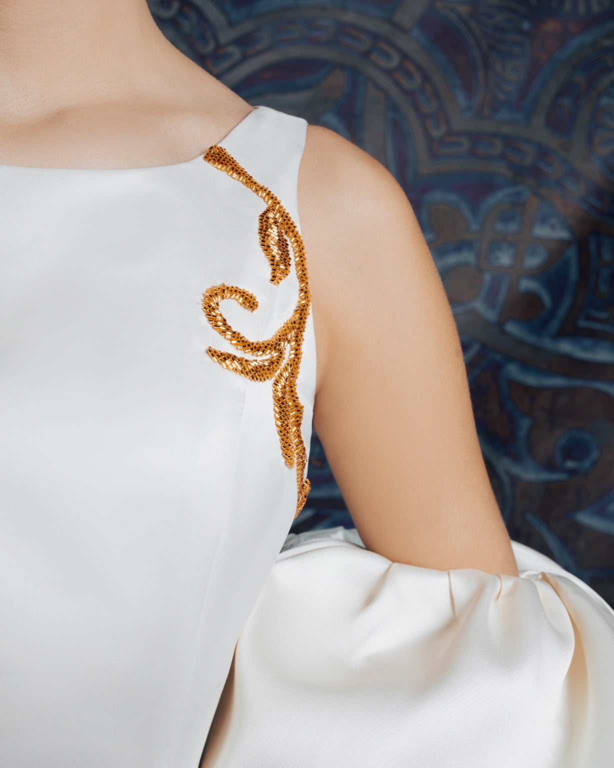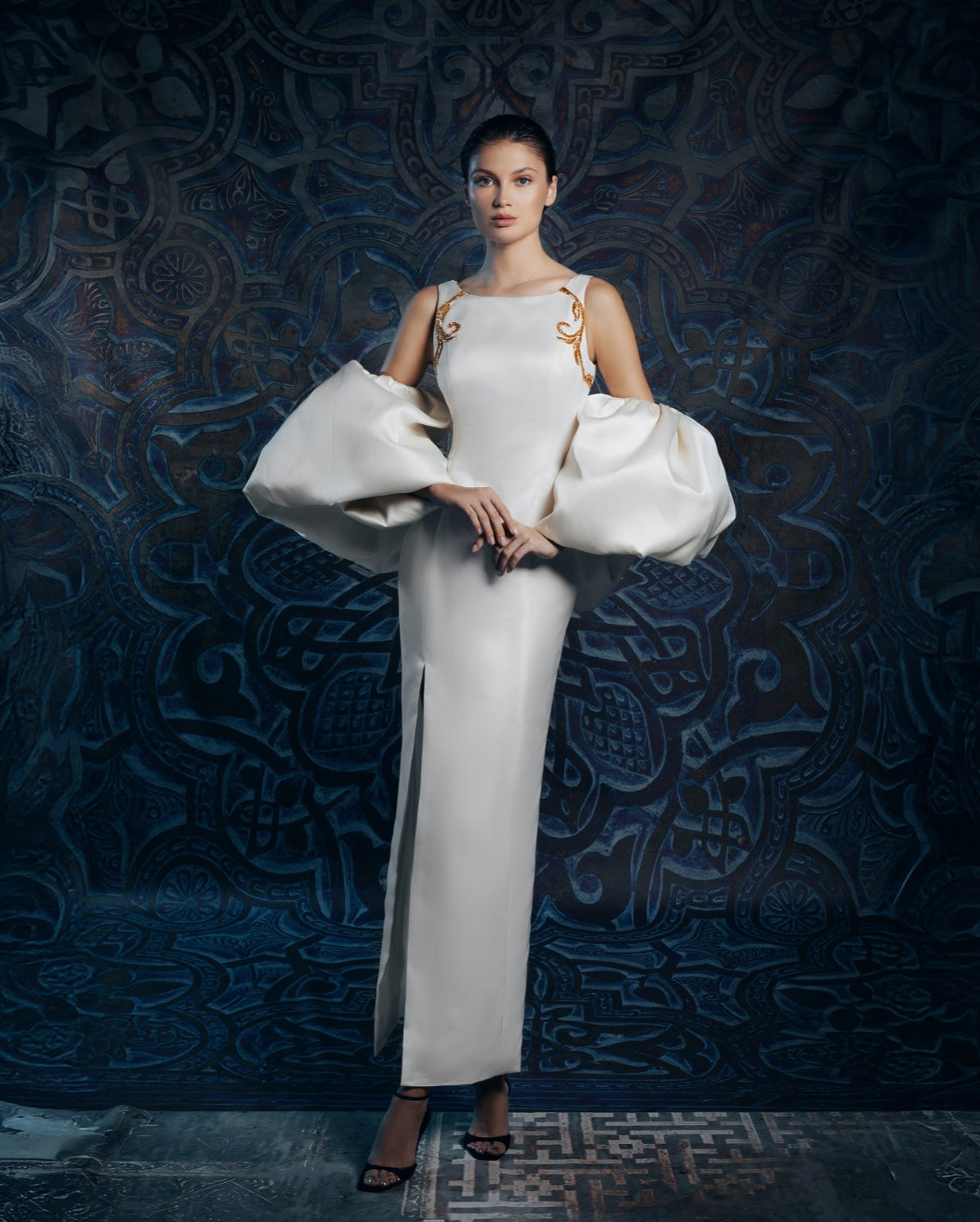 Tailored from fluid crepe, this gown embodies sculptural elegance with a sense of effortless grace. The voluminous puffed sleeves are seamlessly attached from the back, creating a dramatic yet refined silhouette. Golden embellishments trace the shoulders, capturing the radiance and craftsmanship of Andalusian design.