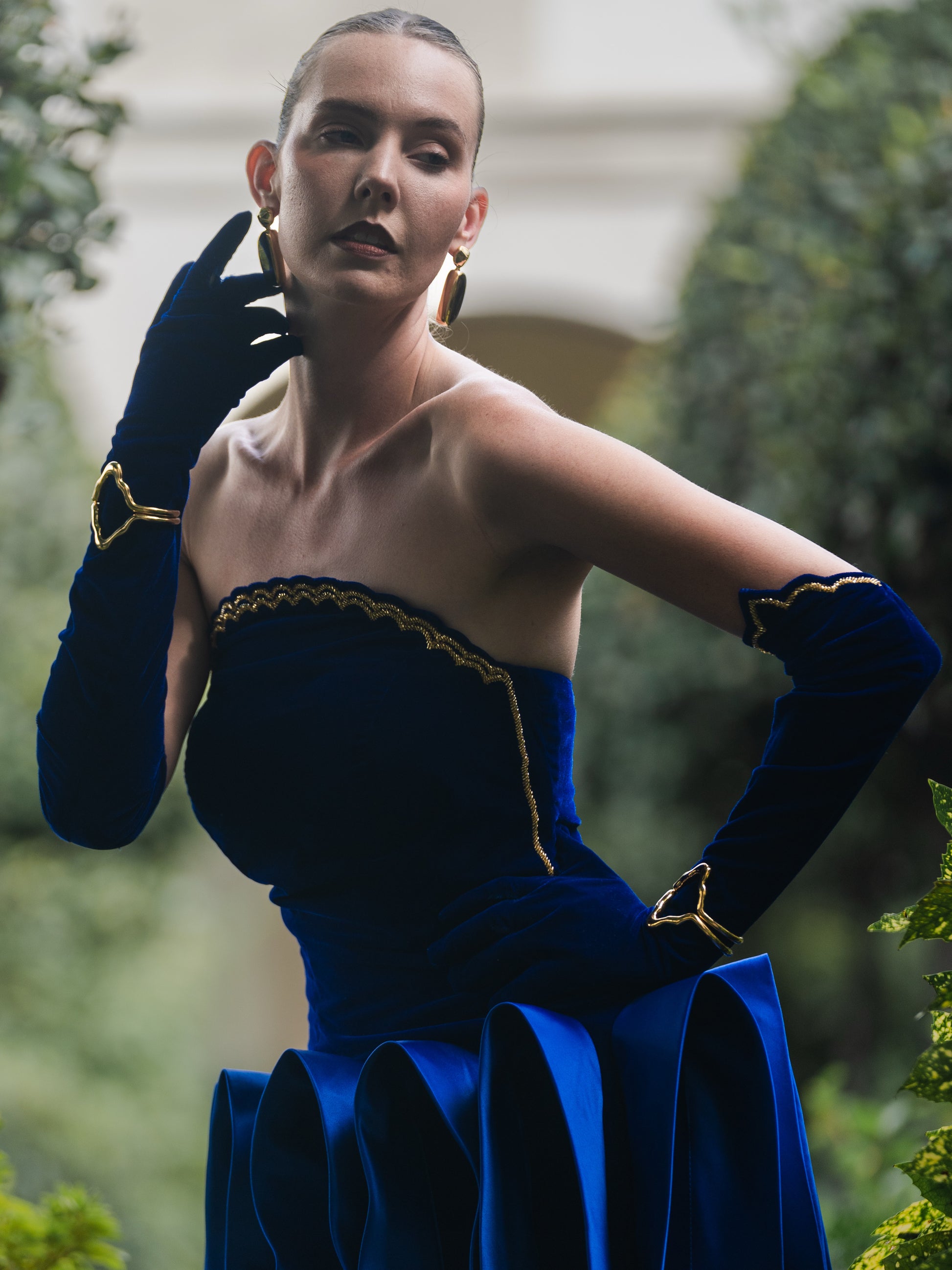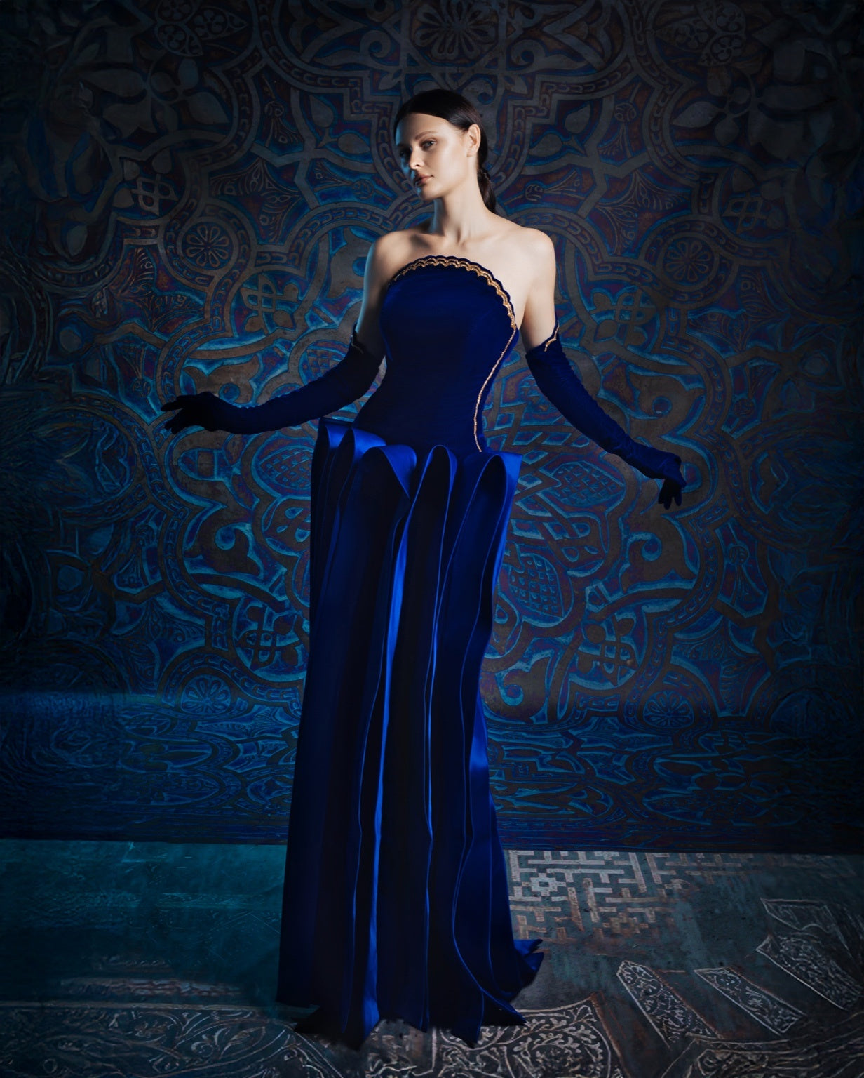 An artistic tribute to the gates of Alhambra Palace this gown combines deep velvet and lustrous mikado in a sculptural interplay of texture and form. The fitted bodice and flowing skirt evoke the palace’s grand arches while the long gloves crafted from velvet and shimmering mikado symbolize the ascending stairways that lead into Alhambra’s golden halls.