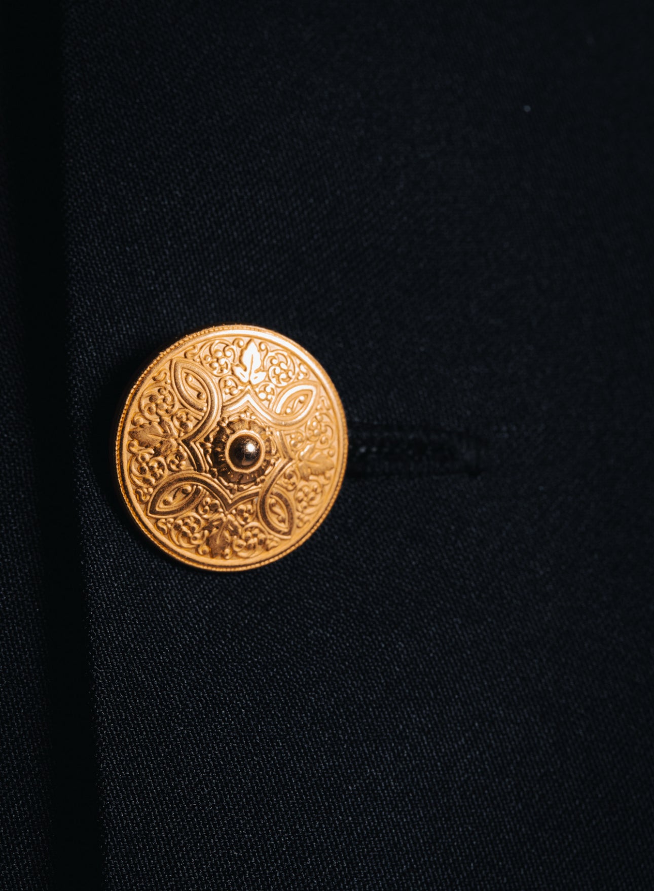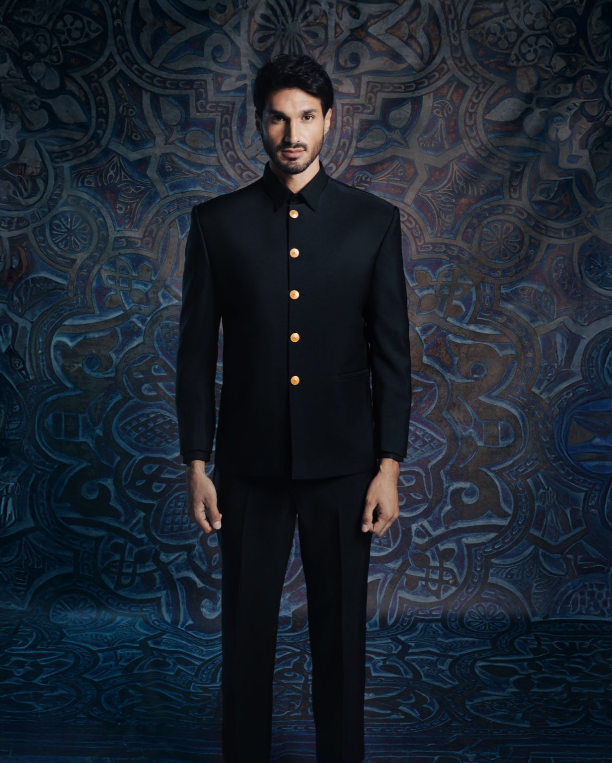 A menswear suit tailored from structured crepe worn over a black cotton shirt for a sleek monochrome look. The jacket features French-made buttons engraved with Andalusian motifs merging craftsmanship and heritage in a contemporary expression of strength and elegance.