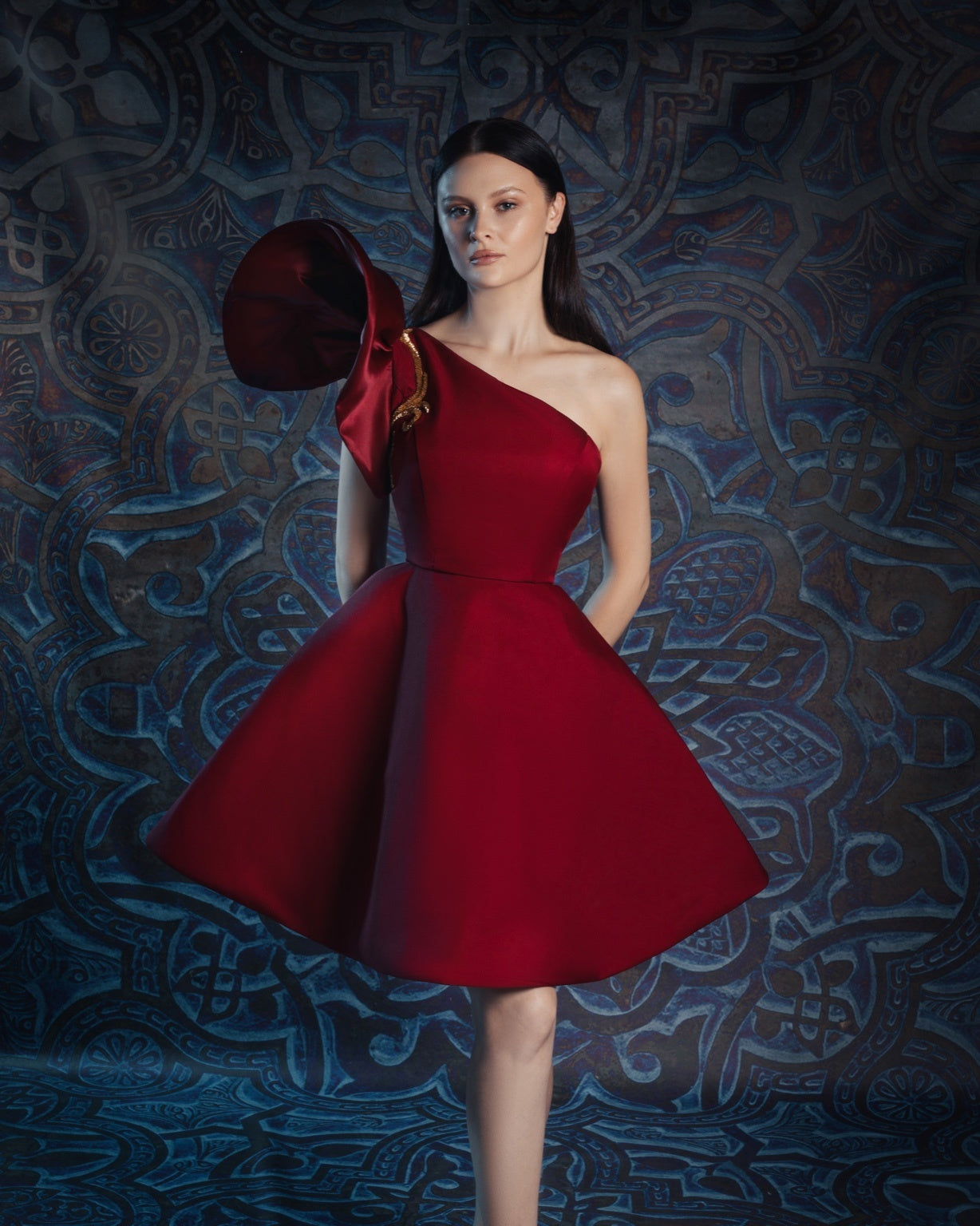 An asymmetric mini dress tailored from luxurious crepe fabric, featuring a sculpted one-shoulder silhouette. The dramatic sleeve detail is crafted from rich mikado, forming a voluminous bow accentuated with golden embellishment.