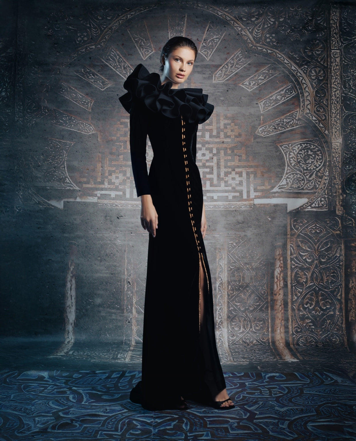 Crafted from rich black velvet with a contrasting crepe neckline, this gown exudes refined sophistication. The central row of ornamental gold-accented buttons elongates the silhouette, while the front slit adds a touch of modern allure. Inspired by Andalusian artistry, it harmonizes classic elegance with contemporary grace.