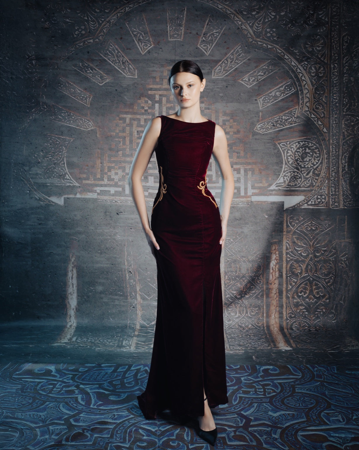 Crafted from deep velvet, this gown is defined by a golden detail at the waist that accentuates the silhouette with subtle refinement. It is paired with a mikado shawl intricately embroidered in antique Andalusian calligraphy, blending artistry and heritage into a timeless expression of royal elegance.