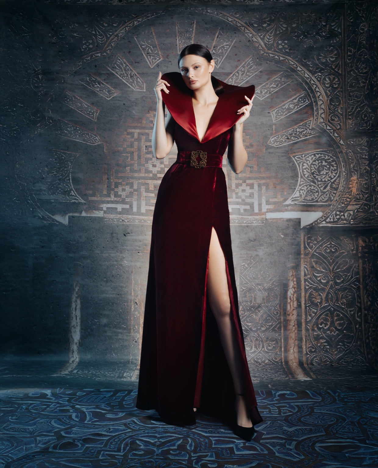 Inspired by the grandeur of Andalusian courts, this velvet gown reimagines royal elegance with a modern edge. The deep crimson hue recalls the opulence of Moorish textiles, while the bold neckline and sculptural silhouette mirror the striking geometry of Andalusian arches